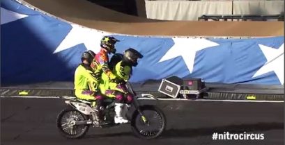 Nový světový rekord v velké show dosáhnout dvou-'Nitro Circus' v Austrálii, kde čtyři jezdci na motocyklu o zpětném otáčení vzduchu.
