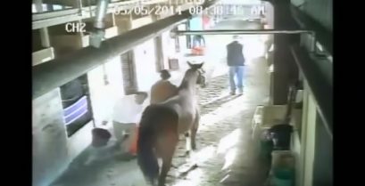 Všimněte si vlevo, nešťastný muž projde před stodolou tohoto 'nebezpečné' koně na dostihové dráze. Nakonec tento kužel byl tam z nějakého důvodu.