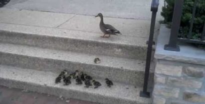 Mama kachna čeká trpělivě jako její mláďata snaží bidélko na obrovské schody.