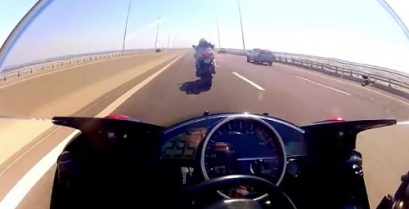 Most Vasco da Gama Lisabon, dva motocyklisté s Yamahou YZF-R6 a R1 podnikají děsivý sprint rychlostí 295 km/h na rovince.