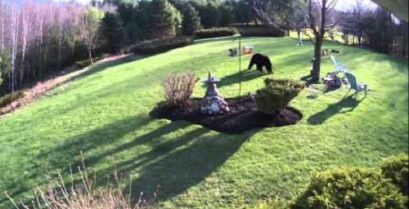 Dva buldoci přeskočí plot ve dvoře domu se vypořádat s velkého černého medvěda v New Hampshire, Kanada. Dva odvážní psi jel medvěda pryč.
