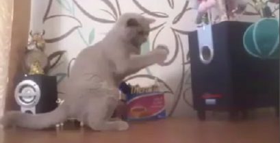 Kočka se snaží chytit vzduch přicházející z subwoofer reproduktor.