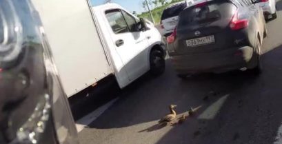 V Rusku, motocyklista pomáhá skupinu Kachňata se svou matkou, se snaží přejít ulici mezi vozy.