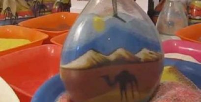 Umělec v Jordánsku vytváří obrazy s barevným pískem v lahvi.
