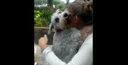 Starší pes 'plakat' radostí z, když člen rodiny se vrací domů po dvou letech. Je tak šťastná, že chvíli ztratí vědomí a rovnováhu.