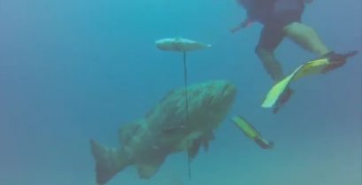 Okoun 'Goliáš' voněl potápěč je kořist, útočit a zpočátku batrachopedilo chytne. Pak krade ryby kopí a odstraněna.