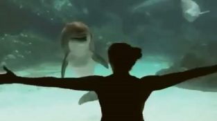 Mladá dívka dělá různé gymnastické kousky jako v akváriu, vzrušující Dolphin.