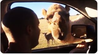 VELBLOUD KRADE JÍDLO Z TURISTOVA AUTA