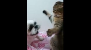 Kočka se snaží bránit pomocí boxerské techniky proti velmi nebezpečný pes Shih-Tzu.