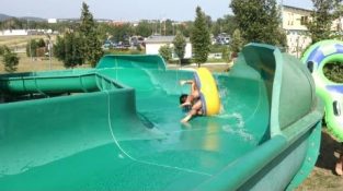 To je zdaleka nejnebezpečnější zapnout vodní park snímek, který jsem kdy viděl. Docela legrační, příliš. Zejména, přihlížející lidé havárii na tobogán. Cha