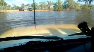 Muž protíná řeka v severní Austrálii, uvnitř Toyota Land Cruiser 80.