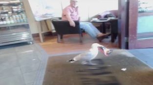 Seagull chodí do kavárny, popadne pytlík brambůrek a listy.