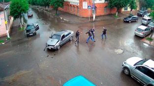 Střet dvou aut v městě Serpuchov, Rusko, a cestující ihned vyjít ze svých vozidel a začít bitvu.