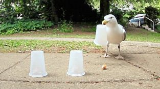Člověk hraje hru s třemi šálky před Racek. Se mi podařilo Racek objevit skryté pochoutka;