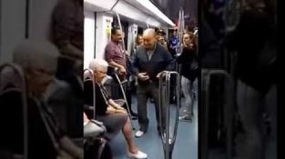 Starší pár probudí cestujícím vůz na metro v Barceloně, když dva z nich dostat až k tanci zvuku hovořit o potulný muzikant.