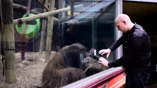 V Zoo v Colchesteru v Anglii, Raj orangutan se snaží napodobit trik s karetní papírem kouzelník. Za sklem, kouzelník Matt G je trik přejetím [...]