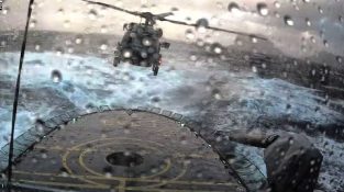 Nová Seahawk MH-60R přistát na lodi v strong gale v severním Atlantiku.