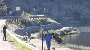 Evergreen jezero v Coloradu, Muž, který dělá tzogking spolu se svým psem, míjejí soba. Sobi se cítil ohrožen přítomností velkého psa, a chránit [...]