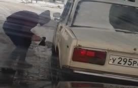 V Rusku, člověk používá sekeru a páčidlo otevřít dveře zamčené auto