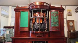 Vyrobeno v Německu kolem 1916, Hupfeld Phonoliszt-Violina je mechanický klavír doprovázen třemi houslí. Hudba hraje automaticky pomocí speciálně konstruované perforovaný papír.
