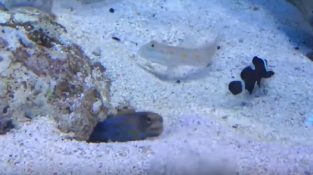 Přehlédnutí trolarei další přehlédnutí kopání, aby své hnízdo pod skálou, v akváriu v Los Angeles, Kalifornie. Zatímco druhý kopání startovní otvor ven [...]