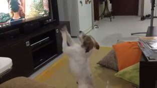 Pes napjatě poslouchá píseň „Despacito“ v televizi, a pokaždé, když jeho majitel zastaví píseň.