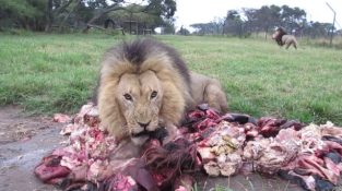 Je stolování pro Lions v Antelope Park, v Gweru Zimbabwe. Tři muži lvi přejet potraviny a dva z nich dostat sousto, Zatímco třetí, nepochybně [...]