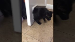 Kočka se pokusí vstoupit do dveří, ale I vyzáblý, Nakonec celé dveře otevírání při pokusu o.