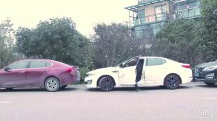 Muž v Číně má potíže xeparkarei svůj vůz. Naštěstí, laskavý kolemjdoucí ochoten pomoci.