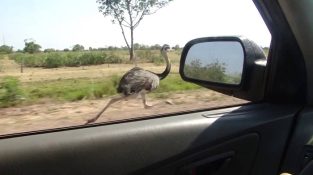 Pštros běží vedle auta cestování na 50 kilometrů za hodinu na silnici. Počínaje vysokou rychlostí, pták ještě projde a řídit trochu překvapující pro cestující.