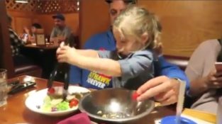 Holčička se snaží sloužit rajčata v misce dědečka, ale to vypadá, že nikdy neskončí.