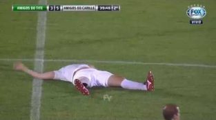 Při přátelském utkání v Kolumbii, hráč Jakson Follmann, přežil havárii Chapecoense, předstírá, že utrpěl křeč v umělém noze.