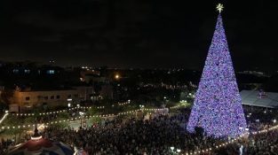 Tisíce dívat jako Santa, vpravo dole na žebříku, osvětluje nový 100’, 800 dolarů,000 Vánoční strom v Delray Beach, Florida. Strom nahradí jiný 100-zápatí, které utrpěly poškození kovový.