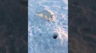 Arktida liška blížící se ruskou rybář, snaží ukrást huňáčka z návnady.