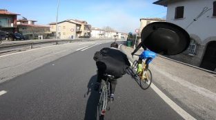 Kněz na malé skládací kolo je šílený běh proti skupině cyklistů v dlouhé klikaté sestupu z hory Titano, Itálie.
