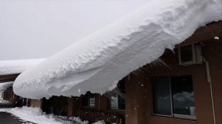 Použití dlouhou tyč, Muž čistí obrovské množství sněhu, nahromaděných na střeše hotelu.
