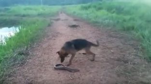 Pes se blíží elektrického úhoře a dělá tu chybu, že kousnutí. Okamžitě udeřil silou a uteče.