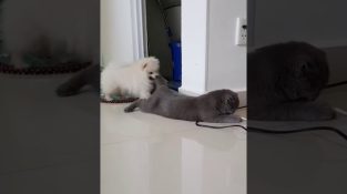 Malý pes hrát podle kousání a tahání za ocas kočky, která se nezdá být obtěžován.