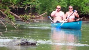 Jezero ve Spojených státech Texas, Jay Karl dělá frašku s bezpilotní aligátoří hlavy.