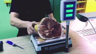 Řezník Dmitry Kolesnikov z Ruska ukazuje techniku používanou některými řezníci klamat své klienty vážit maso.