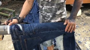 Ve výstavbě řemesla kalhotové džíny ve Vietnamu, Vidíme, že dělníci vytvářejí ozdobné zářezy v nohách.