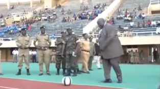 Před začátkem fotbalového utkání, sport ugandský ministr kopne míč a padá k zemi.