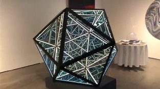 Toto je „Portál Ikosahedr“, dílo umělce Anthony James, sestávající z jednosměrné zrcadla, LED světla a ocel.