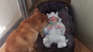 Chiko, Shiba Inu plemeno psa, sledoval s velkým zápalem nový člen rodiny.
