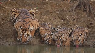 Na horké ráno v květnu v Indii Chandrapur, matka tygr a tři mláďata pitné vody na okraji jezera.
