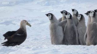 Skupina malých císařských tučňáků ohrožena velkým Petrel v antarktickém ledu, když nečekaný hrdina dorazí, aby je zachránil... Ukázka z dokumentu BBC One 'Spy in the Snow'.