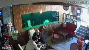 Ve městě bar Nikšić v Černé Hoře, velká skleněná akvária najednou zlomí.