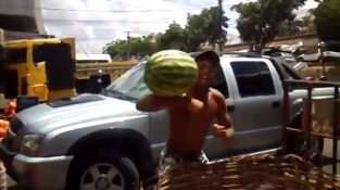 Mladý muž má zvláštní talent pro zachycení vodní melouny bez použití dlaněmi.