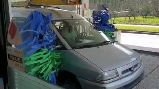 na Halloween, Dva mladíci oblečené ve Španělsku mytí auta kartáči. Zatímco v čerpací stanici, zábava řidiči mytí auta.
