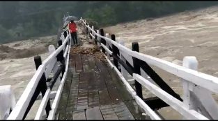 Dva lidé prodírají dřevěný most přes valící se vody z řeky Pabbar, město Rohru v severní Indii. K incidentu došlo během velkých povodní v regionu dne 18. srpna.